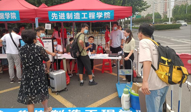 2021年9月2日上午7:00,先進制造工程學院研究生黨支部的學生黨員與入黨積極分子于合肥學院北大門迎新工作站開展21級碩士研究生入學志愿服務工作。