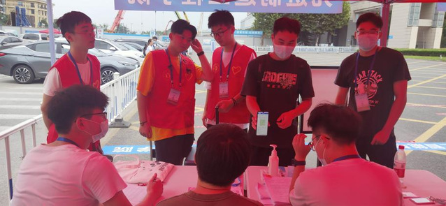 為切實施行學校防疫要求,學生黨員何林負責驗證研究生新生的安康碼與行程碼,并收取其48小時內核酸檢測報告以及入學申請表。工作過程中,何林同志細心認真,對每一份材料都反復確認,仔細核驗。學生黨員孫勝愛負責發放新生校園一卡通與新生入住通知單,并引導新生辦理銀行卡。偶有其他工作人員有突發情況,為確保迎新工作順利進行,孫勝愛同志也主動幫忙頂上。