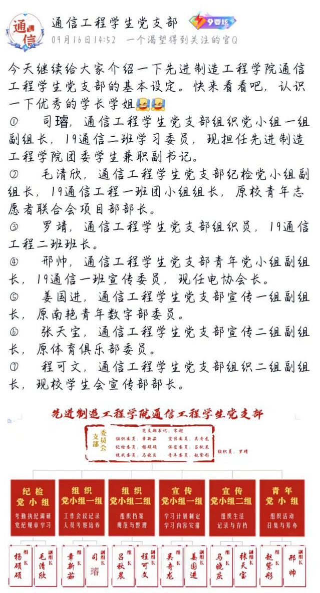 為讓2021級新生對通信工程學生黨支部有初步的了解,9月16日,通信黨支部通過官方QQ的方式,向新生們介紹了支部的組織架構及人員分配。