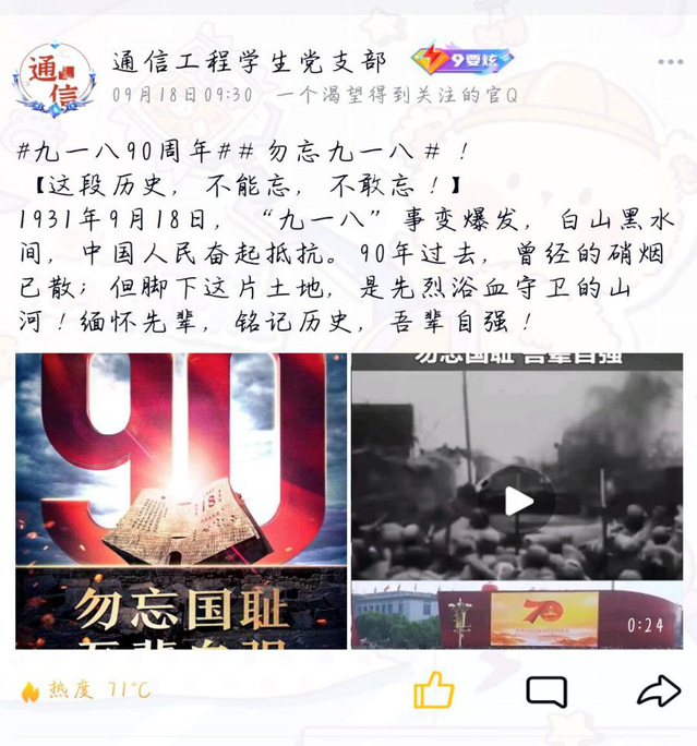 為緬懷先烈,銘記“九一八”事變的歷史,樹立黨員的憂患意識,鼓勵黨員有責任敢擔當,通信工程學生黨支部在“九一八”事變爆發90周年之際,以“勿忘九一八”為主題,針對九一八事件展開了深刻的討論和學習。