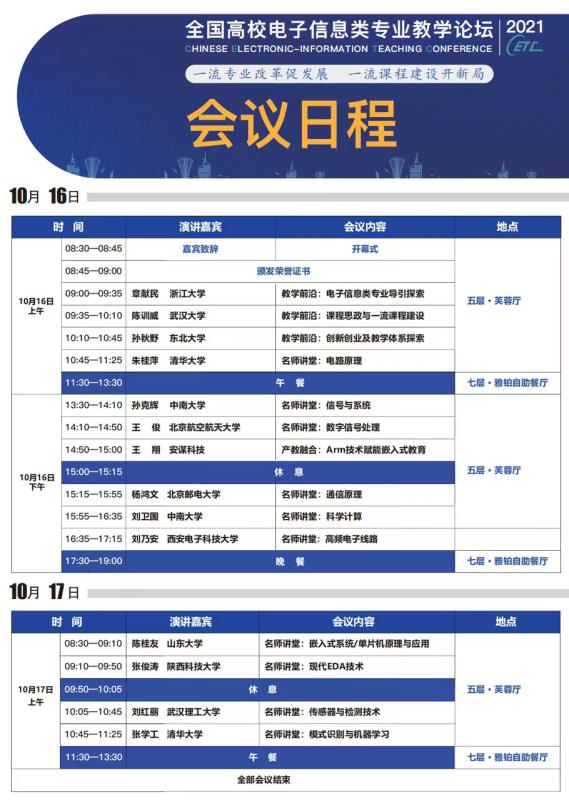 2021年10月16日至10月17日,全國高校電子信息類專業教學論壇(2021)在長沙隆重舉行。該論壇由教育部高等學校電子信息類專業教學指導委員會主辦,中南大學和清華大學出版社承辦,旨在深入落實全國教育大會精神,貫徹落實新時代全國高校本科教育工作會議精神,落實教育部《關于加快建設高水平本科教育全面提高人才培養能力的意見》《教育部關于深化本科教育教學改革全面提高人才培養質量的意見》,搭建教學建設與課程建設經驗交流的平臺,推廣優秀教學成果,推動電子信息類專業本科教育內涵式發展。