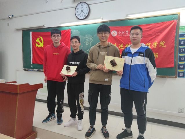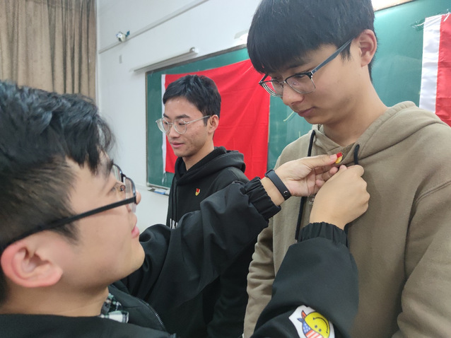 大會第三項,支委會成員給發展對象彭相、杜學浩頒發了賀卡,并佩戴黨徽,贈予了杜文濤同志《習近平談治國理政》,對于他們的新身份,支部書記沈丹丹提出了新的要求,希望他們能在各方面再接再厲,做出自己的貢獻,還要繼續以一名黨員的標準嚴格自己,全面提高自己。