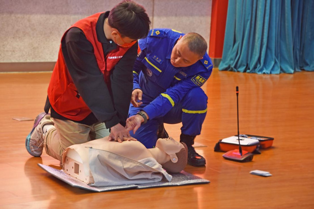隨后,合肥市藍天救援隊劉曉冬書記為在場師生講述了心肺復蘇的相關知識,讓大家明白了心臟驟停的原因、心肺復蘇的完整流程、AED(體外除顫儀)的使用方法及注意事項等,并通過圖片展示、真實案例、現場演示等多種方式講述胸外心臟按壓手法、人工呼吸等心肺復蘇步驟,讓大家掌握了科學的救生常識和整套心肺復蘇流程。現場同學還積極參與模擬練習,21級機制班孔力同學認為:“在劉書記的專業指導下,我很快掌握了心肺復蘇和人工呼吸這兩項技能。以后遇到突發情況就不會再束手無策,可以盡自己所能提高身邊突發疾病患者的生存幾率,這讓我感到非常自豪。”