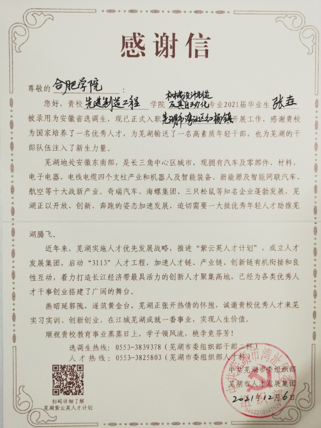 2021年12月15日,中共蕪湖市委組織部給合肥學院先進制造工程學院發來感謝信,對先進制造工程學院學子奉獻基層的表現點贊,希望學校能夠大力支持蕪湖發展,進一步加強多領域合作,引導和鼓勵更多優秀畢業生到蕪湖干事創業、建功立業。