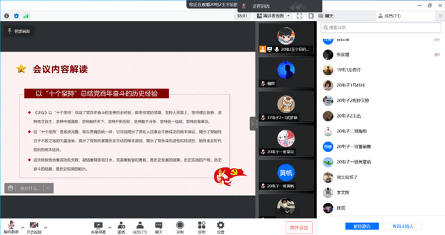 作為學生黨支部,要高標準高質量做好發展黨員工作,從嚴從實抓好黨員教育管理,組織引導黨員發揮先鋒模范作用,以加強基層組織建設,鍛造高素質黨員隊伍。會議最后,王宇辰同學與黨支部成員共同學習了十九屆六中全會精神,簡述了《中共中央關于黨的百年奮斗重大成就和歷史經驗的決議》的重要內容和作用。