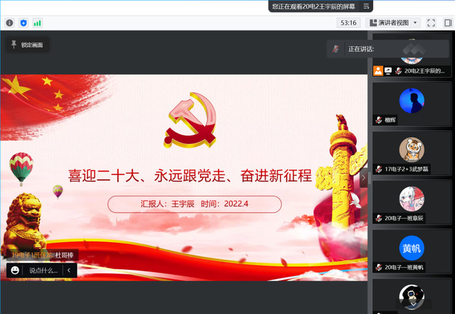 由于疫情防控影響,此次學習會在線上開展,全體黨支部成員準時參加。由王宇辰領學此次“喜迎二十大、永遠跟黨走、奮進新征程”的學習會。會議首先介紹了近十年來新中國發展成就,鼓勵黨支部成員發揚歷史主動精神,以實際行動迎接黨的二十大勝利召開;會議中間王宇辰帶領我們聚焦重溫習近平總書記“紅色”足跡,了解習近平總書記寶貴的精神財富,讓黨支部成員從紅色精神中汲取前進力量,奮發向上。