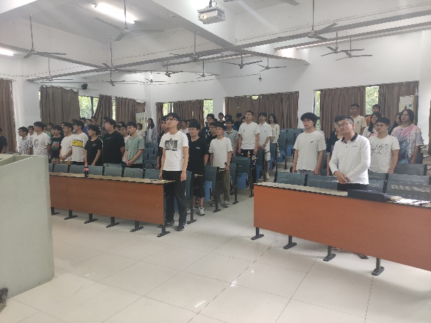 表決通過后,全體成員起立共同奏唱國際歌,雄壯的國際歌氣勢昂揚,表達了無產(chǎn)階級渴望解放自己,解放全人類的強烈愿望。我們每名黨員定會不忘初心、牢記使命,為實現(xiàn)共產(chǎn)主義偉大理想而奮斗終身!國際歌結(jié)束后,支部書記梅志強帶領(lǐng)新黨員入黨宣誓、老黨員重溫入黨誓詞。