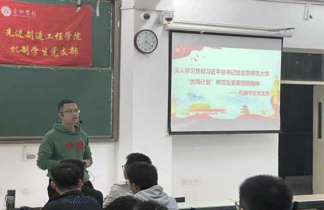 為了深入學(xué)習(xí)貫徹習(xí)近平總書記給北京大學(xué)“優(yōu)師計劃”師范生的重要回信精神,把扎實的學(xué)習(xí)成效切實轉(zhuǎn)化為奮進新征程、建設(shè)新時代的強大動力,2022年10月8日晚上18:30,機制學(xué)生黨支部與所轄新生團支部在38-2JT教室開展了專題學(xué)習(xí)活動,本次座談會由黨支部書記威力旺老師主持。