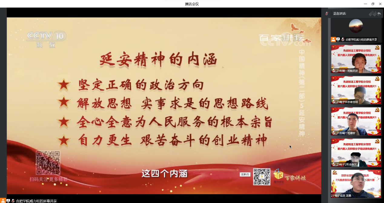 2022年11月5日上午10:00,先進(jìn)制造工程學(xué)院第六期入黨積極分子培訓(xùn)班在騰訊會(huì)議平臺(tái)線上舉行了第一次電教片學(xué)習(xí)活動(dòng),74名學(xué)員準(zhǔn)時(shí)簽到參加。本次電教片為《百家講壇》欄目中國(guó)精神特別節(jié)目中的“延安精神”與“紅旗渠精神”,該片通過(guò)講述革命圣地延安與建造紅旗渠的故事,指引新時(shí)代青年人應(yīng)正確看待、繼承和弘揚(yáng)誕生于艱苦歲月中的延安精神與紅旗渠精神。