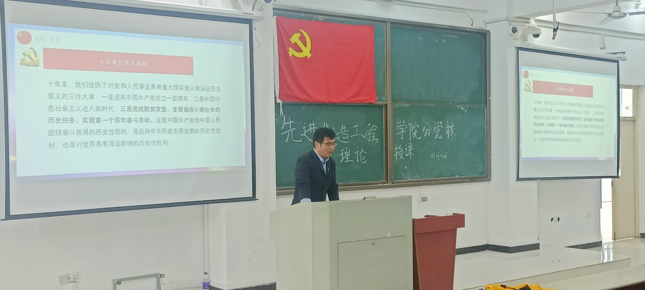 2022年11月16日中午12點45分,先進制造工程學院分黨校第六期入黨積極分子培訓班在38棟3階梯教室開展了第三次黨課教學。本次黨課由學校黨委辦公室、院長辦公室汪文忠主任蒞臨授課,機制學生黨支部書記威力旺老師主持,先進制造工程學院分黨校第六期入黨積極分子班共70名學員參加了本次課程,本次黨課主題為“黨性的光輝閃耀在脫貧攻堅路上”。