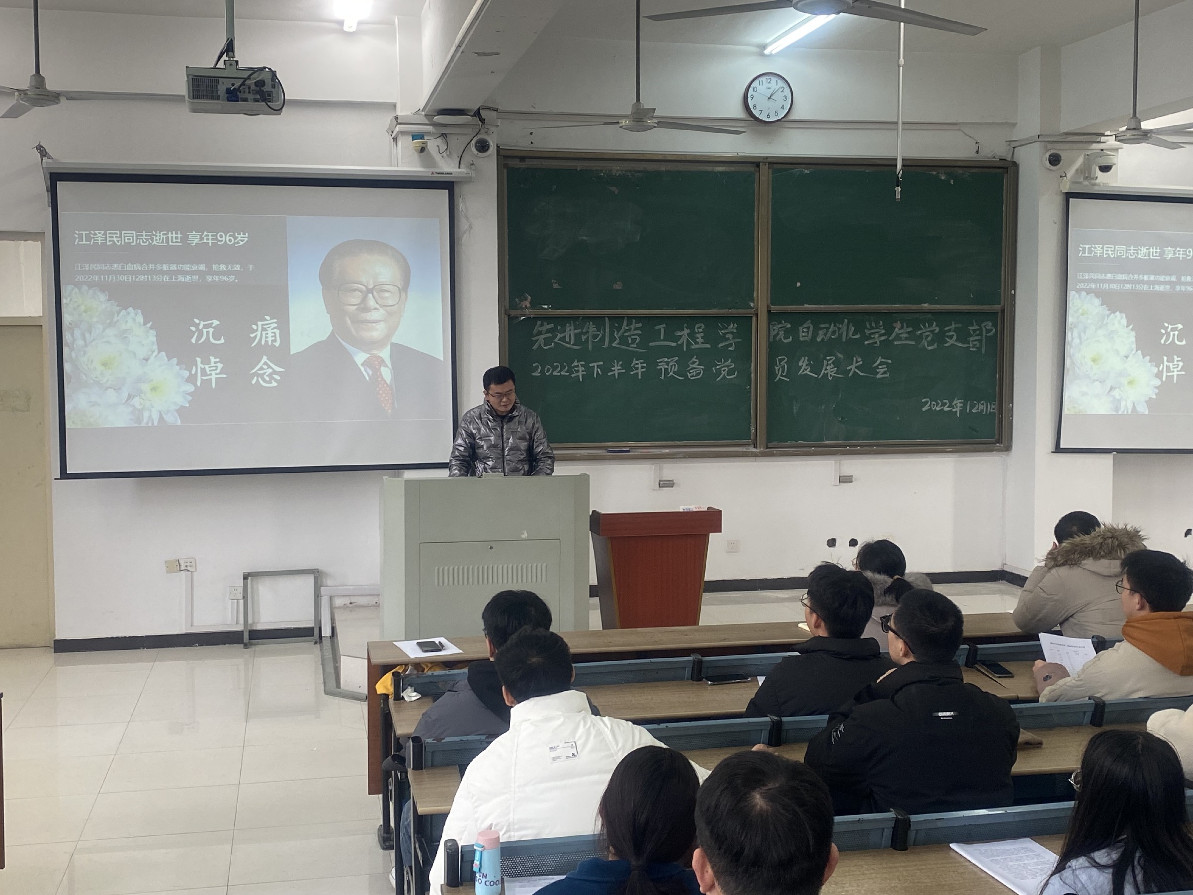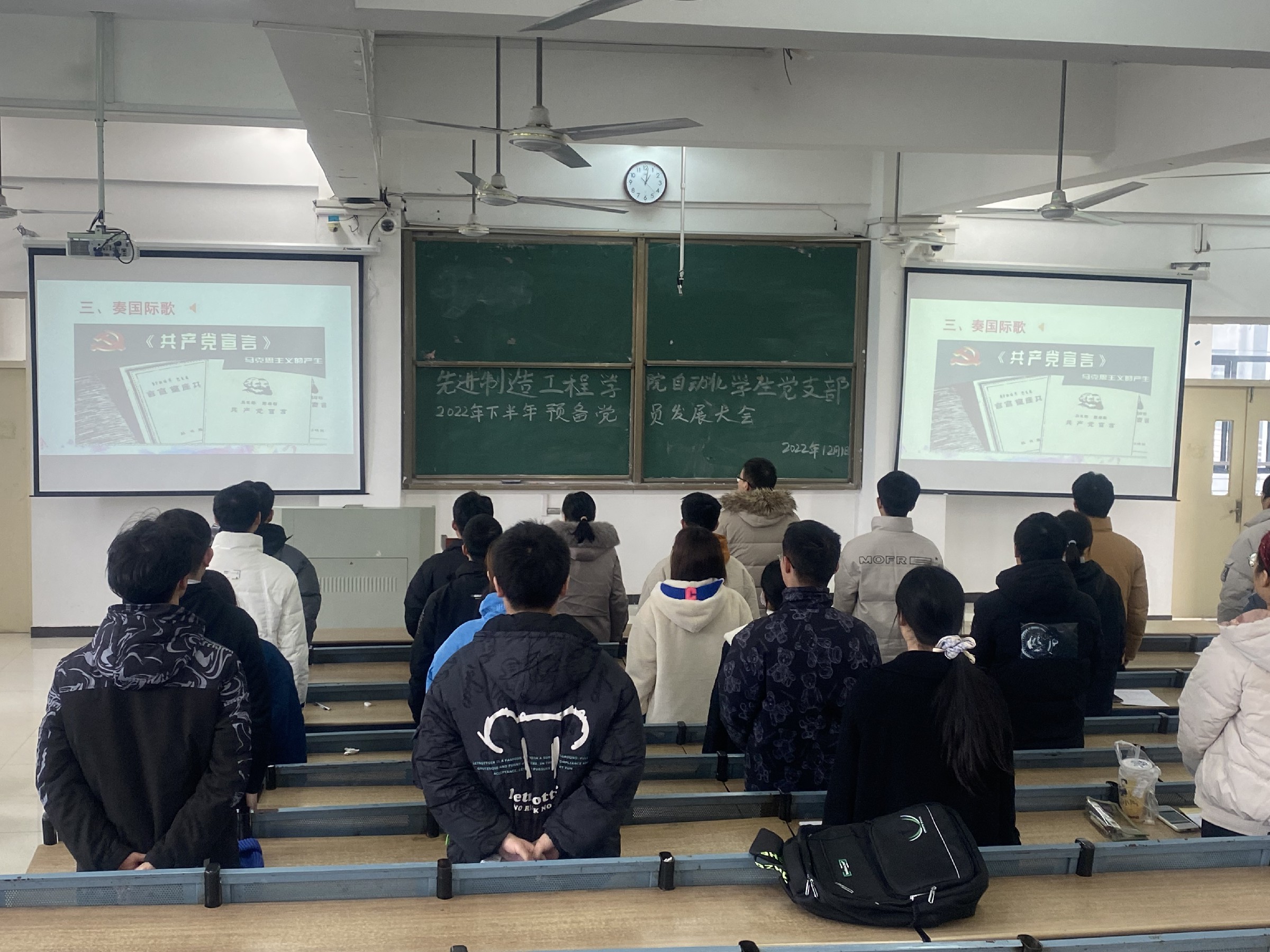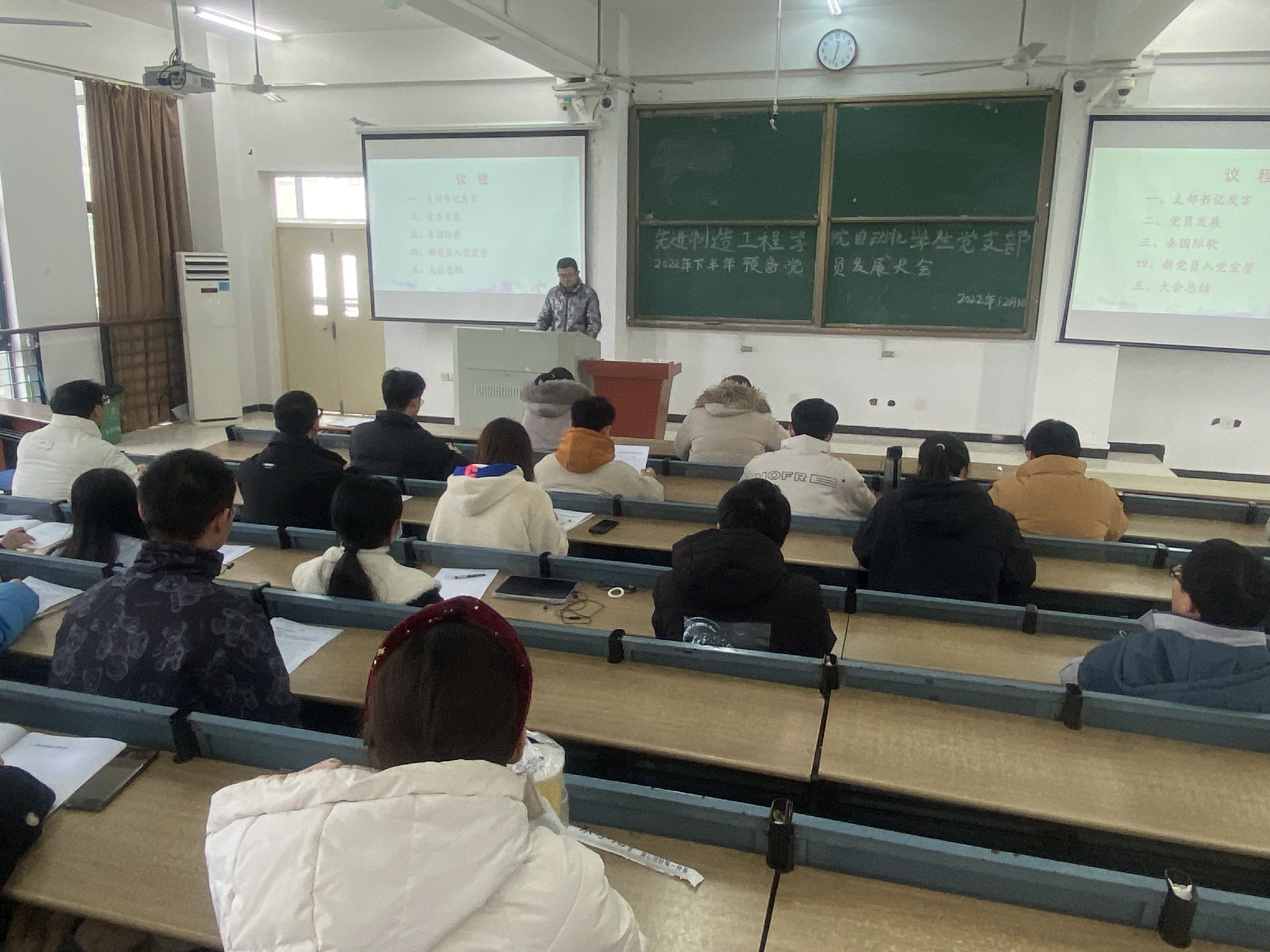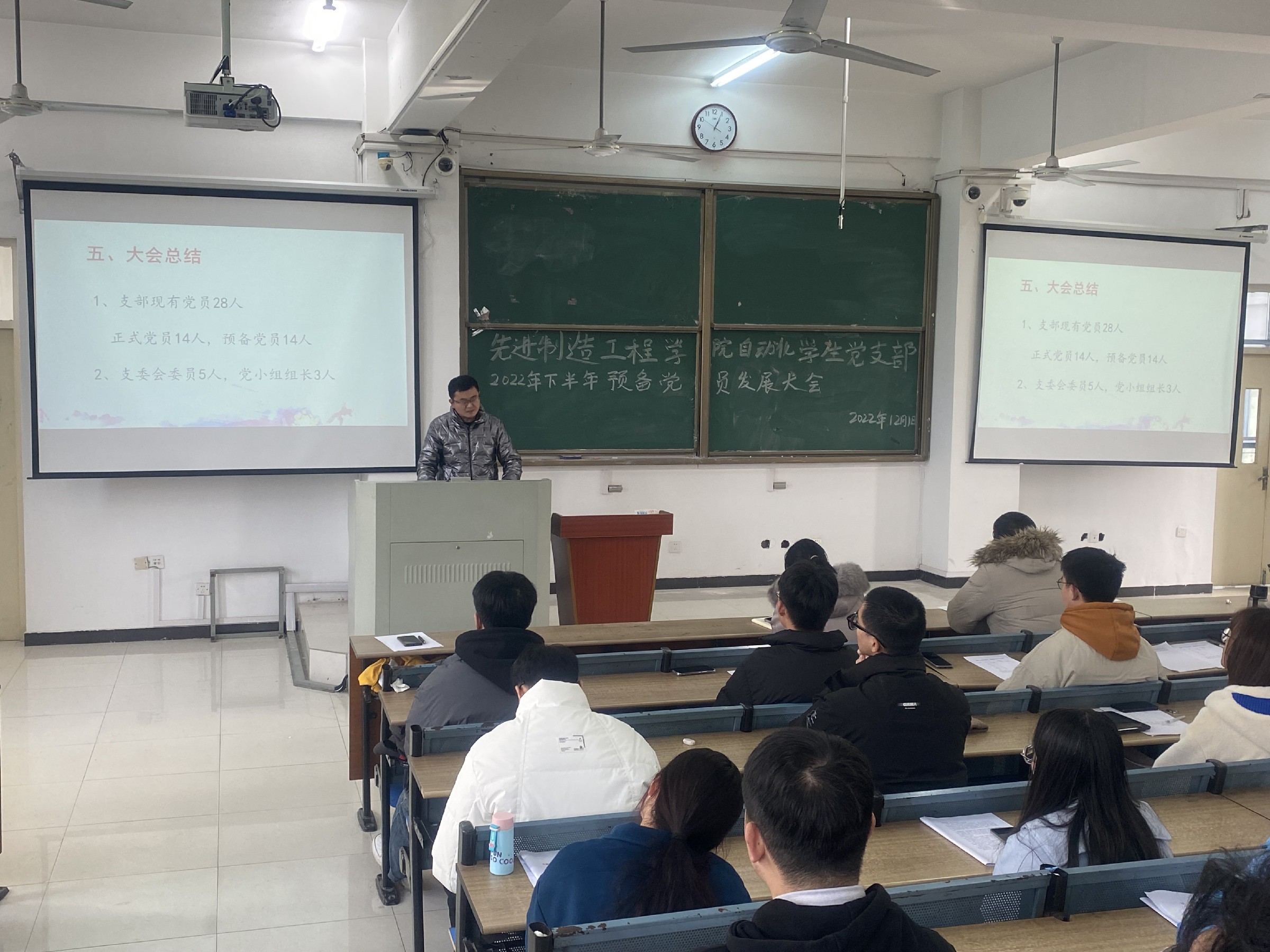 2022年12月1日中午12:30,先進制造工程學院自動化學生黨支部于38棟3階梯教室開展了2022年下半年預備黨員發展大會。本次大會應到黨員22人,實到黨員22人,學院黨委副書記蔡靈美到會指導,大會由支部書記梅志強主持。