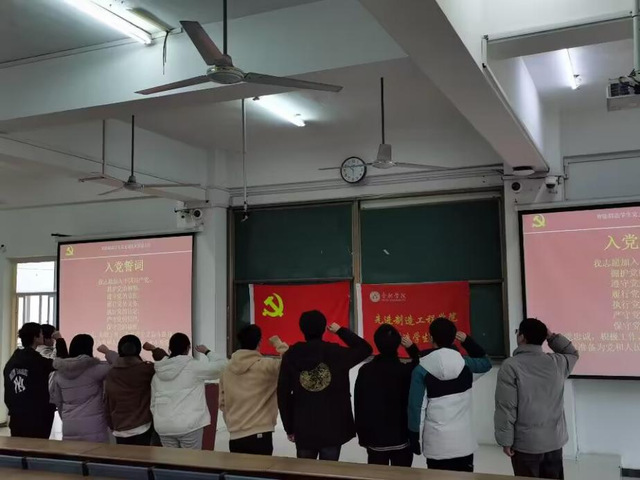 會(huì)議第五項(xiàng),由正式黨員谷濤同志帶領(lǐng)9名同志宣讀入黨誓詞。