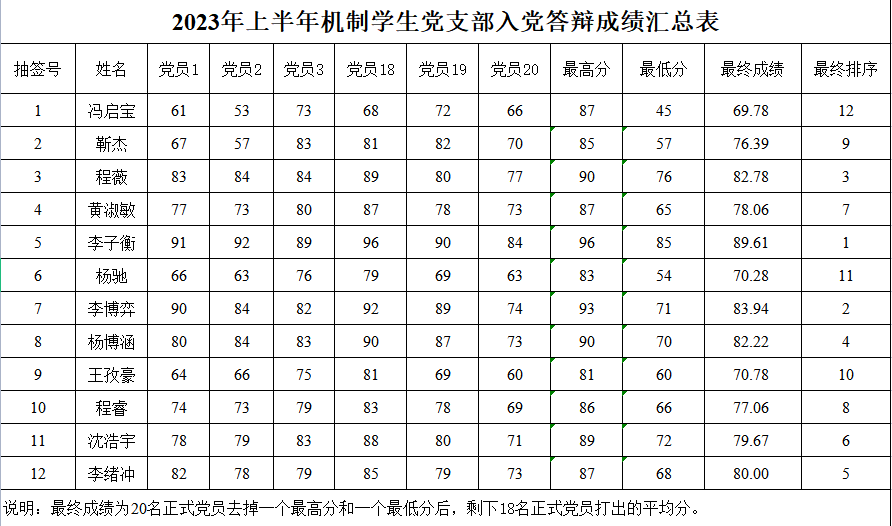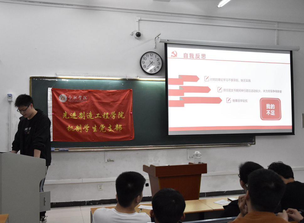 最后,每位正式黨員公正客觀地對匯報人的綜合表現進行現場評分,最終20機制2班李子衡獲得89.61分,21機制1班李博弈獲得83.94分,21機制3班程薇獲得82.78分,21機制2班楊博涵獲得82.22分,21機制2班李緒沖獲得80分并均被確定為本學期的發展對象。