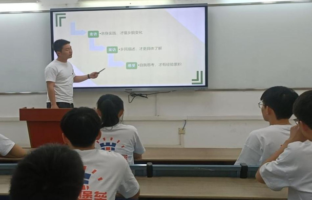 章俊學長以紅心向黨為主題講述自己在2022年暑期三下鄉活動的籌備、內容、成果及在“行知學堂”支教實踐中的經歷和感想,讓大家全面掌握到暑期社會實踐活動的相關運行機制和開展流程,并希望同學們攜肯干實干能干的的精神投身于今年暑期的社會實踐,向社會展現合院風采。
