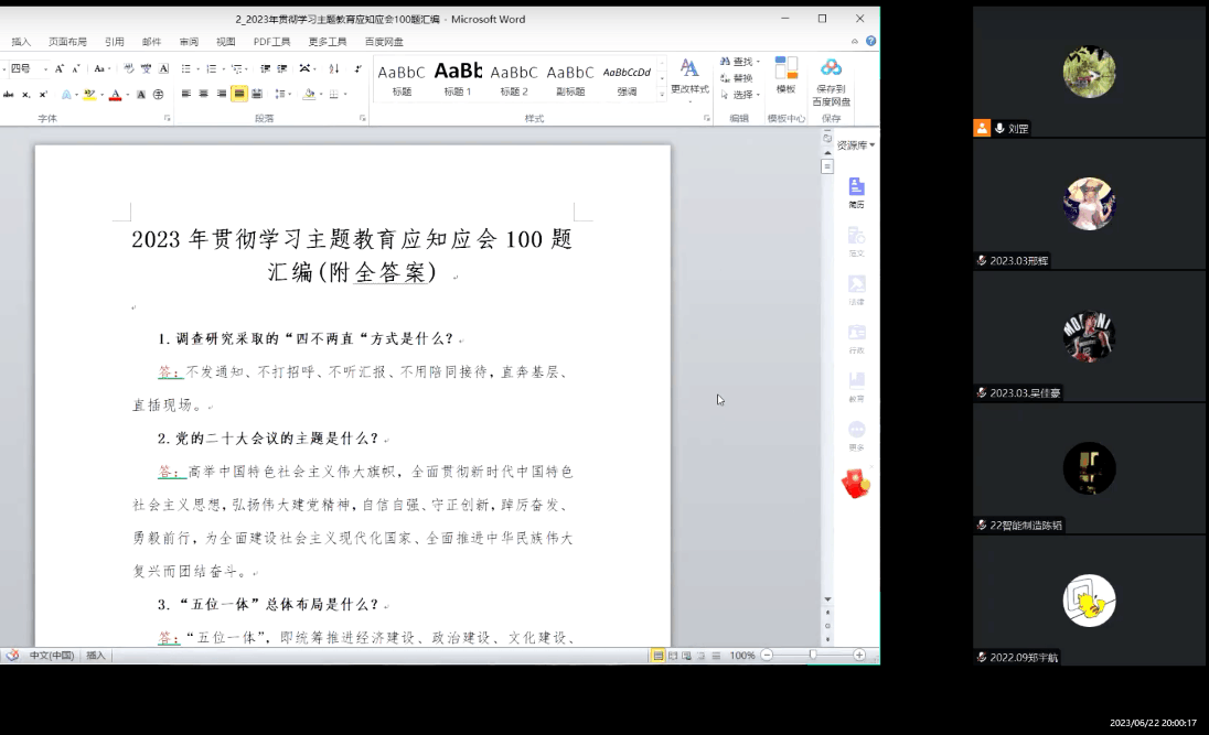6月22日晚,智能制造學生黨支部在線上舉行了主題教育6月理論學習會。全體黨員和入黨積極分子參加了學習會。