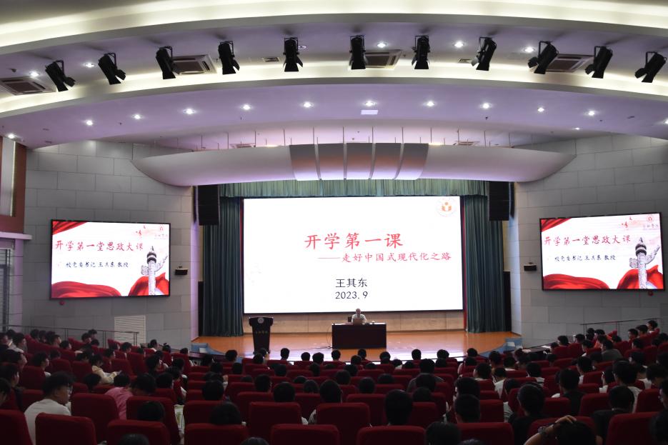 為深入學習宣傳貫徹習近平新時代中國特色社會主義思想和黨的二十大精神,引導廣大青年明確努力方向和奮斗目標,9月28日下午,校黨委書記王其東以“走好中國式現代化之路”為題在學術報告廳A廳為先進制造工程學院23級新生和黨員代表講授“開學第一課”。先進制造工程學院黨委書記杜娟主持講座,副書記蔡靈美、分團委副書記鐘倫鎖和研究生第一黨支部書記沈丹丹等老師參加講座。學院部分學生黨員代表和23級新生共三百余人共同聆聽。