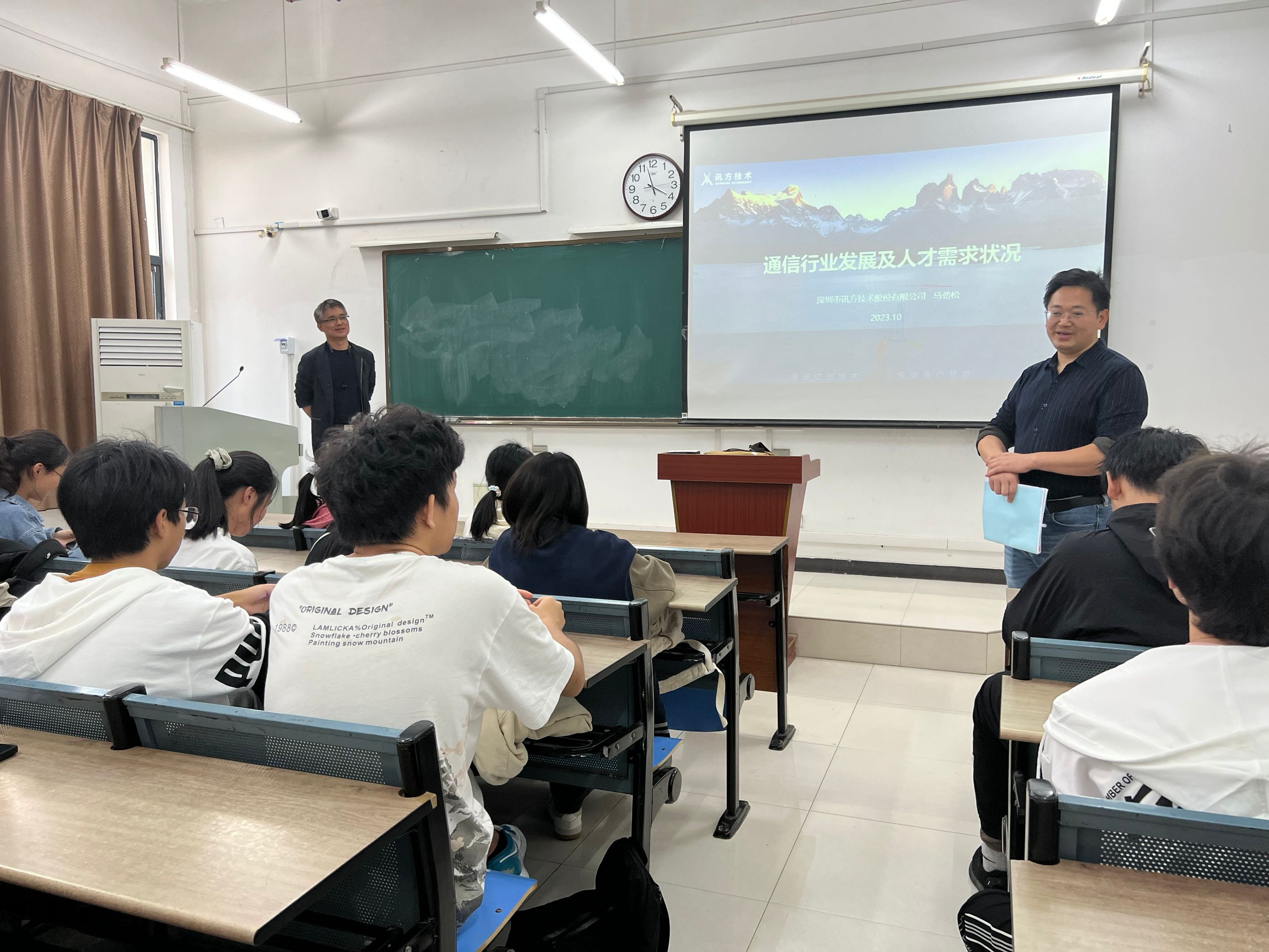 10月26日,專業邀請了深圳市訊方技術股份有限公司華中片區產品交付中心總監馬勁松做了《通信行業發展及人才需求狀況》的專題報告。報告從通信技術發展史展開,圍繞5G相關技術、5G產業的發展、5G產業的規模及5G產業應用場景逐一進行了介紹,并向同學們闡述了職業發展的路徑。