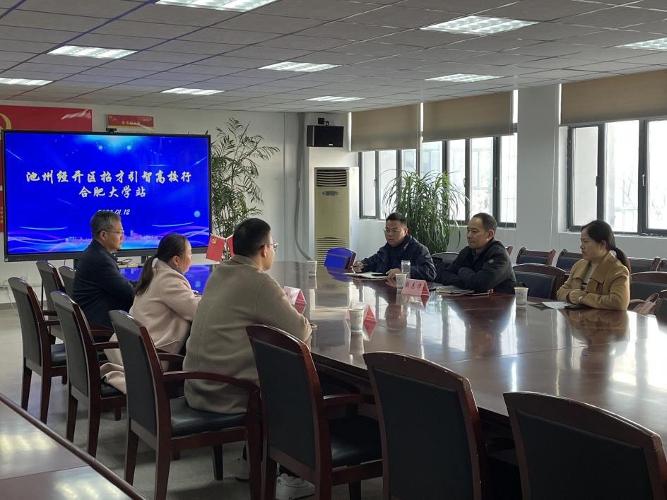 為推動產學研協同創新,尋求政校企合作共贏、共謀發展的良好局面,2024年1月12日,池州經濟技術開發區黨工委委員、黨群工作局(人才辦)局長(主任)錢志華率隊來我院開展池州經開區招才引智高校行活動,先進制造工程學院黨委書記杜娟、副院長秦強、就業聯絡員張傲參加。