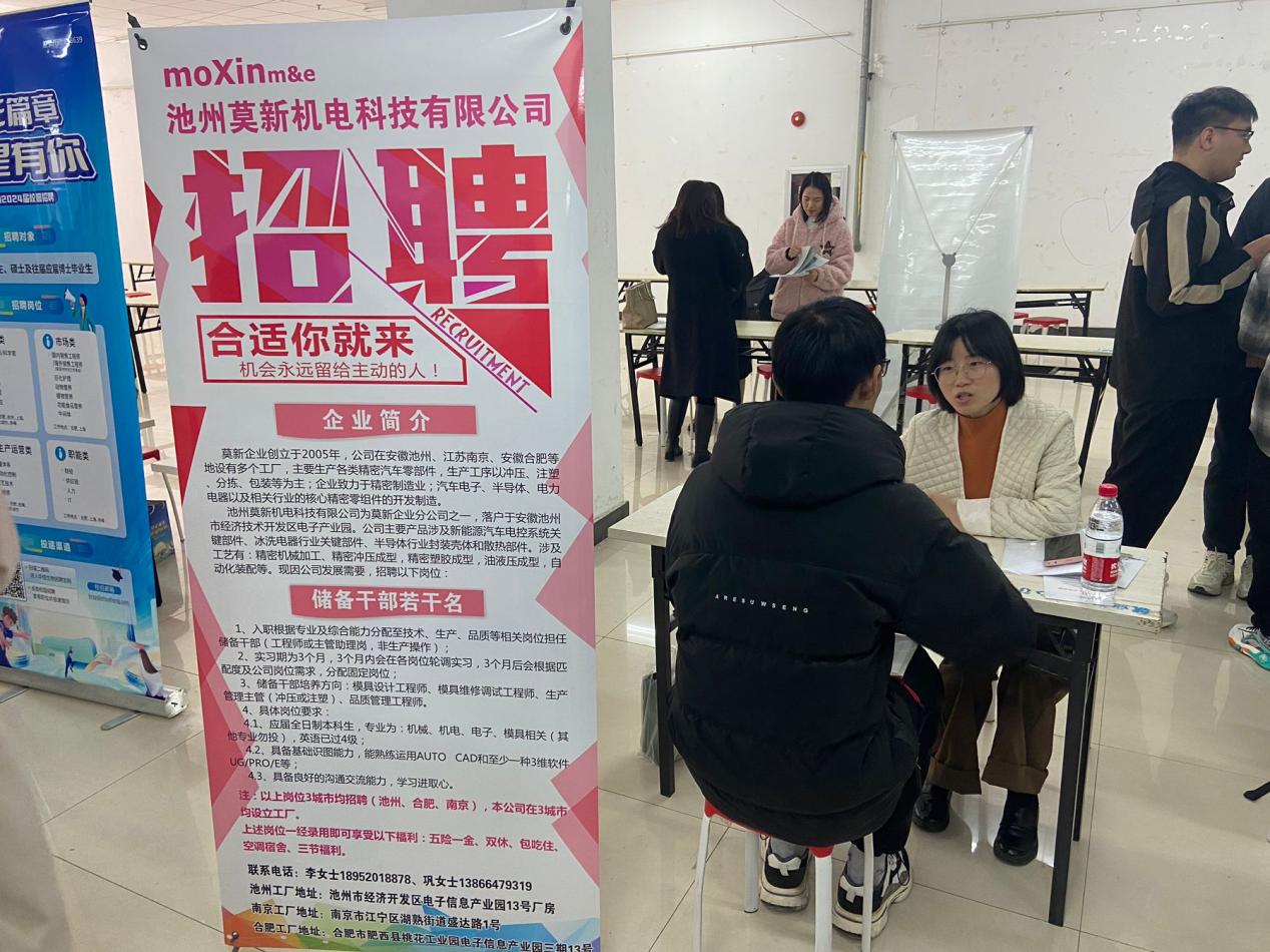 為加強與用人單位的聯系和交流,準確把握企業用人需求,提高就業率,推動院地、院企合作,幫助企業尋找高新科技人才,2024年3月15日下午,先進制造工程學院于圖書館一樓舉辦池州經開區專場招聘會。本次招聘會是我院與池州經開區進行人才對接招聘,包括池州莫新機電科技有限公司、恒峰銳(池州)智能裝備有限公司、華宇半導體有限公司、彭工智能裝備制造(池州)有限公司、池州天賜高新材料有限公司等線上線下共10余家招聘單位,招聘需求涉及我院多個專業,為我院畢業生提供就業崗位39個,235個人才需求。我院黨委副書記蔡靈美、學工辦主任劉罡、畢業班輔導員、專業班主任及部分畢業生參加招聘會。