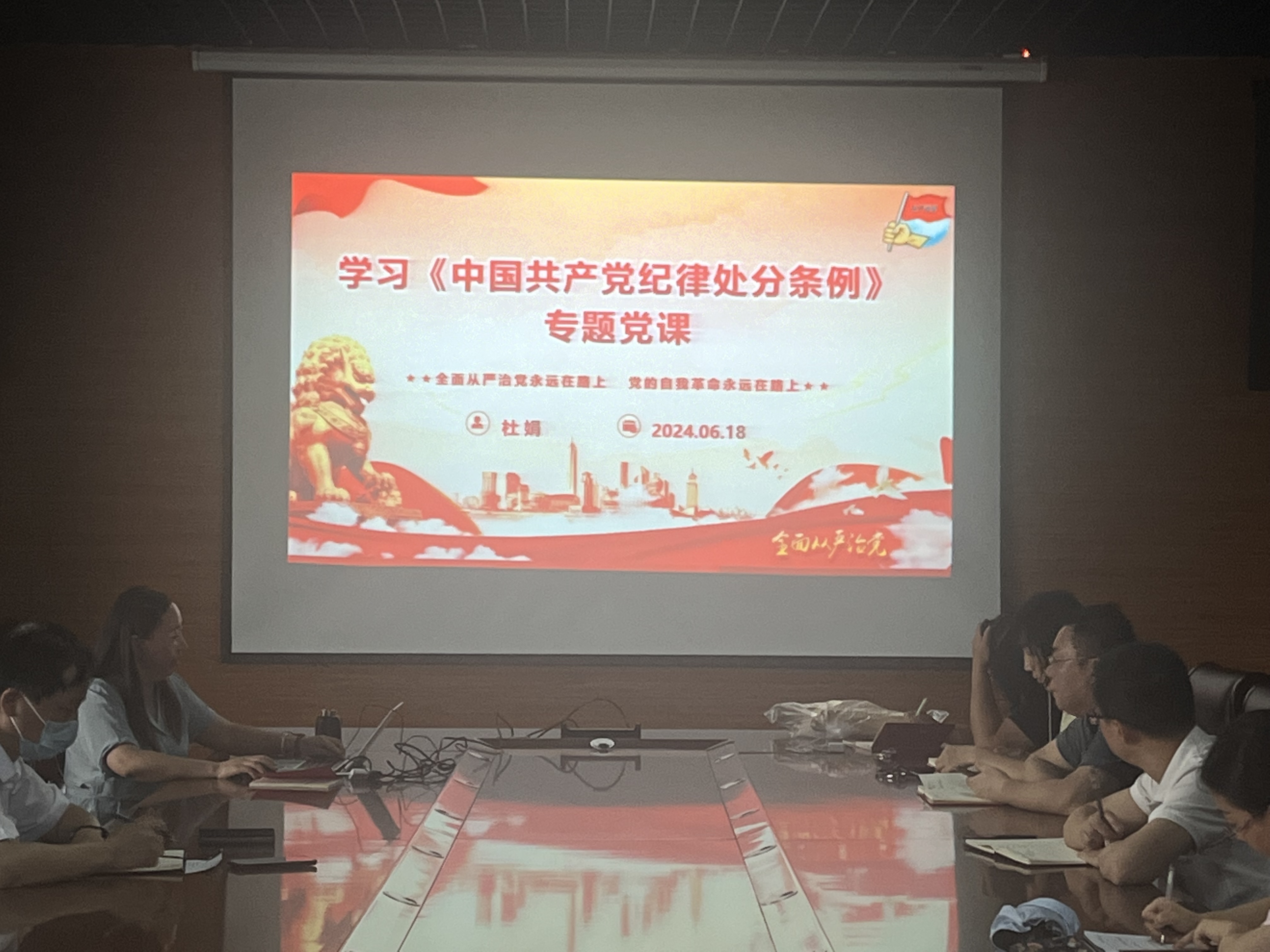 杜娟從《中國共產黨紀律處分條例》(以下簡稱《條例》)的修訂背景和主要過程、重要意義、新修訂的《條例》的特點、學習貫徹新修訂的《條例》的內容和要求等方面作了詳細闡述,指出了開展黨紀學習教育的目標任務和具體措施,并進行案例分析。她號召全體黨員以黨紀學習教育為契機,做到學紀、知紀、明紀、守紀,進一步強化紀律意識、加強自我約束、提高免疫能力,增強政治定力、紀律定力、道德定力、抵腐定力,不斷提升黨支部的創造力凝聚力戰斗力。