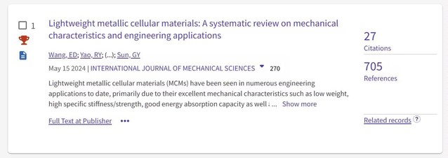 根據科睿唯安(Clarivate Analytics)公布的2024年7月ESI最新數據, 我校先進制造工程學院青年教師王二冬2024年以合肥大學為第一單位在《International Journal of Mechanical Sciences》期刊上發表的長篇綜述論文“Lightweight metallic cellular materials: A systematic review on mechanical characteristics and engineering applications”(Volume 270, May 2024)成功遴選為ESI高被引論文。目前,Web of Science數據庫顯示該文獻已經被引用27次。《International Journal of Mechanical Sciences》雜志是機械工程/力學領域國際權威期刊 (中科院一區Top,影響因子:7.1),這是我校機械領域首篇以第一單位入選為ESI全球前1%高被引論文,是我校學科建設取得重要的科學研究成果。