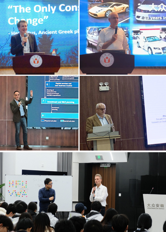 2023-2024學年第一學期,大眾學院聯合大眾安徽舉辦了5次企業客座教授理論授課與認知實習活動。學??妥淌凇⒋蟊姲不帐紫瘓绦泄俑鹜铉C博士、首席財務官哈約根博士、首席技術官呂爾曼博士、首席數字官高樂夫先生和首席制造官施耐德先生,為學生進行精彩授課。