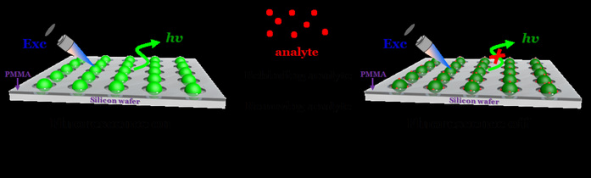 In this paper, it is mentioned that the synthesized SiO2@MIPs forms a microsensor array on the regular dot array of etched silicon wafers by self-assembled technique, and four heavy metal ions, whose LOD concentration is 10?9 mol·L?1, enter the nanostructured shell-layer with fluorescence-tagged recognition site driven by concentration differences. The recognition sites have highly selective recognition of heavy metal ions with sensitive responses. Based on FRET principle, ultra-trace detection of the target analytes can be achieved, which solves the problem of identification and detection of polymetallic ions.