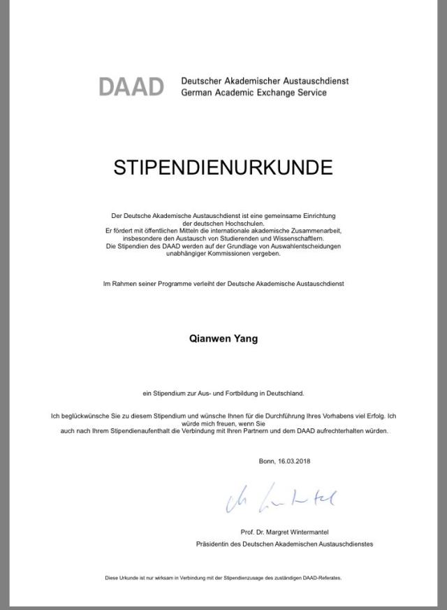 This is the first time that German majors have got a DAAD scholarship, which is designed for those to be engaged in the teaching of German.Yang Changli and Yang Qianwen took the German Language Proficiency Test at Nanjing University in November, 2017 and achieved much better than expected. What’s more,Yang Changli participated in the National Multilingual Interpretation Contest and won the Excellence Award in the same year. They have set a good example for their counterparts in the Department of Foreign Languages.