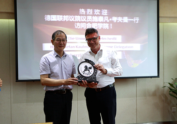 President Wang expresses a warm welcome to Mr. Stefan Kaufmann and his delegation. He introduces to the guests HFU’s development and school-running orientation of localization, application and internationalization. Due to the 33-year sino-German co-building, he says that HFU attaches great importance to the cooperation and hopes to further exchanges with German universities.