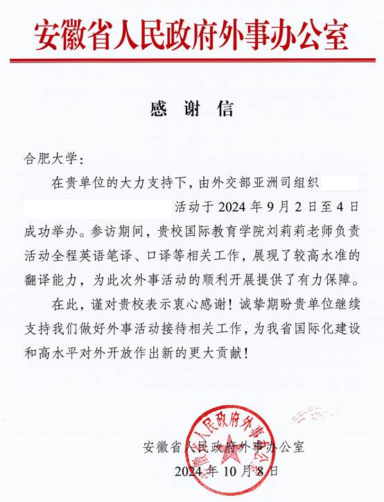 近期,合肥迎來了來自泰國、馬來西亞、越南、柬埔寨、馬爾代夫等8個國家的網紅博主,他們齊聚這座科技創新之城,深入體驗合肥的科技魅力和產業發展。而為了確保這次國際交流活動的順利進行,合肥大學特別選派了劉莉莉老師提供全程翻譯服務,助力他們更好地了解合肥的發展故事,得到安徽省人民政府外事辦公室的充分肯定。