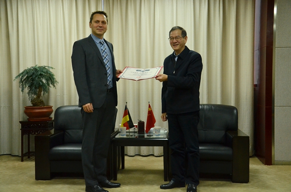 11月15日下午,葉夫根尼-阿列克謝夫教授一行與校長王其東進行了會談,人事處處長陳愛娟、國際交流合作處處長賈峰、化工系主任董強等陪同與會。王其東簡要介紹了我校的辦學歷史、辦學定位、教育教學改革以及中德合作共建情況。葉夫根尼-阿列克謝夫教授對我校的辦學模式以及取得的成績給予了很高的贊賞。他還表示,自己每年所帶的很大一部分做畢業(yè)設計的本科生以及研究生均來自當?shù)氐膩嗚每茖W大學,對這些應用科學大學學生的學習以及動手能力表示青睞,他建議將來亞琛工業(yè)大學與合肥學院能在研究生培養(yǎng)、師生交流等方面開展合作。王其東為葉夫根尼-阿列克謝夫教授頒發(fā)了我校客座教授聘書,并希望以此為契機,雙方今后開啟相關領域的進一步合作。隨后葉夫根尼-阿列克謝夫教授一行還參觀了合肥學院先進功能助劑研發(fā)中心以及中德合作共建合肥學院30周年成果展。