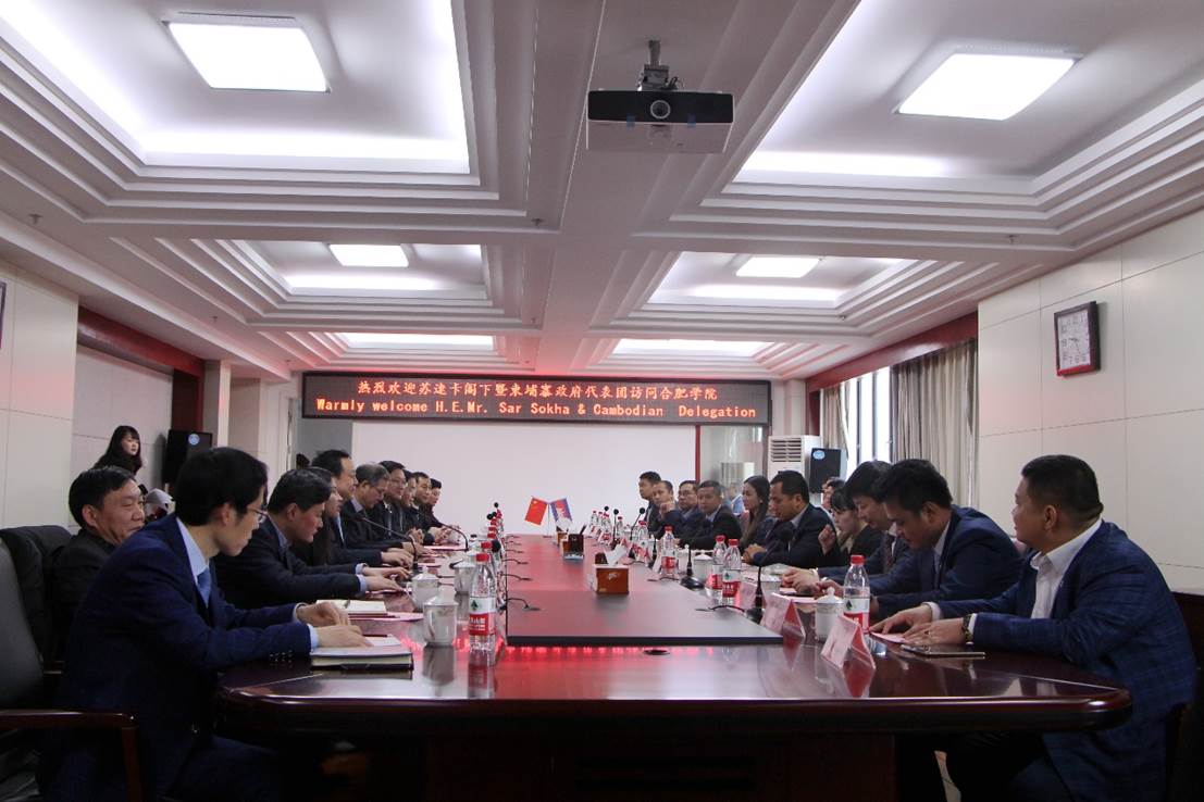 會上,蔡敬民對柬埔寨政府代表團的到來致以熱烈歡迎。他表示,合肥學院在校柬埔寨學生已達一百余人,希望在未來能招收更多柬埔寨優秀學生來我校就讀學位。接著,他就學校教育現狀及中外合作項目進行了詳細的介紹,他表示我校具有三十多年與德合作教學的經驗,是全國應用型本科院校第一方陣的排頭兵。截止至今我校已接待一千三百多批次國內高校來訪,可以為柬埔寨留學生的發展提供一個較好的交流平臺。