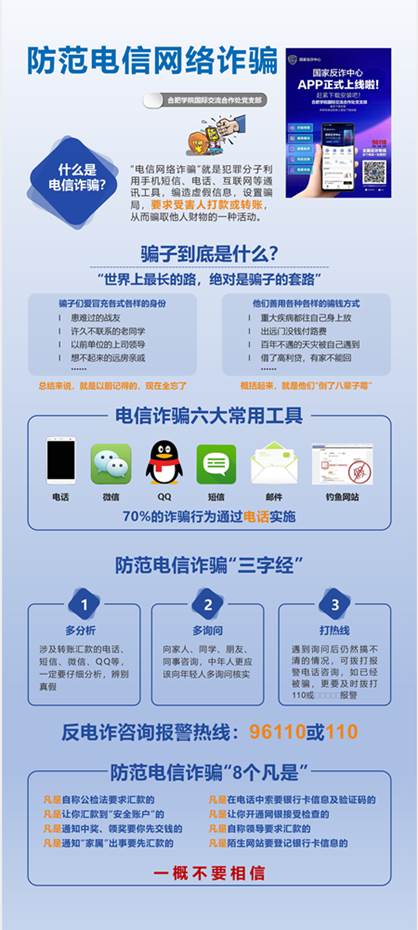 2021年11月30日中午12點(diǎn),國際交流合作處黨支部利用中午休息時(shí)間,走進(jìn)一期食堂和留學(xué)生公寓,開展 “謹(jǐn)防電信詐騙 加強(qiáng)安全意識”的宣傳活動。