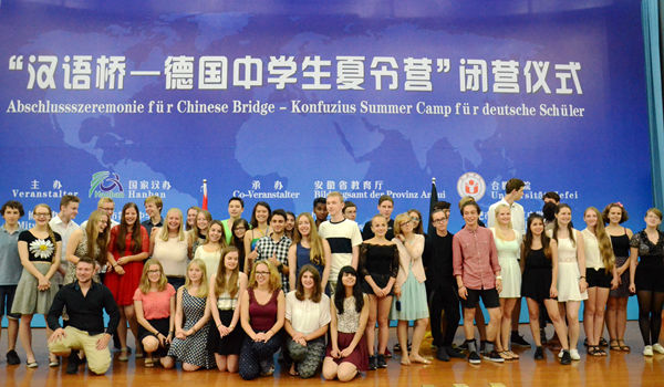 8月12日,由國家漢辦主辦,安徽省教育廳、合肥學(xué)院承辦,合肥市第六中學(xué)、合肥市一六八中學(xué)、合肥市三十二中學(xué)協(xié)辦的2015年“漢語橋—德國中學(xué)生夏令營”閉營儀式在我校圖書館學(xué)術(shù)報告廳A順利舉行。安徽省教育廳外事處副處長孔德俊、德國漢諾威孔子學(xué)院院長蔡琳、德國薩克森州教育官員凱思婷·史托伯格、德國漢諾威孔子學(xué)院中方理事長胡春春、合肥學(xué)院國際交流合作處處長賈峰等出席閉營儀式,各協(xié)辦單位領(lǐng)導(dǎo)和代表及“漢語橋-德國中學(xué)生夏令營”的師生們參加儀式。