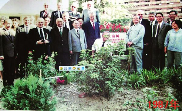 1987年,德國下州議長布蘭克先生率團來訪,在友誼樹前與安徽省人大與學校領導合影