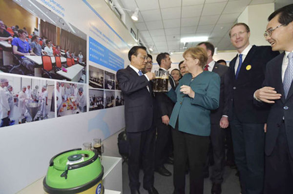 30日上午,李克強總理與德國總理默克爾在合肥學院食品專業交流合作展區共同品嘗我校學生釀制的德國黑啤。(中國新聞網  人民網消息)