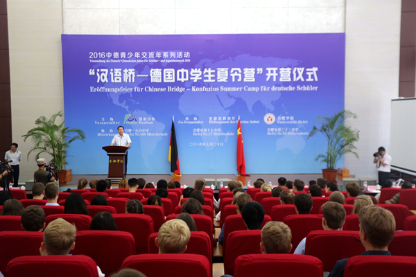 7月20日,2016年“漢語橋—德國中學生夏令營”開營儀式在合肥學院圖書館順利舉辦。本次活動由國家漢辦主辦,安徽省教育廳、合肥學院承辦,合肥市一六八中學、合肥市第十七中學、合肥市第三十二中學協辦。安徽省教育廳副廳長楊金龍、合肥學院黨委書記蔡敬民、合肥學院副院長劉建中、德國漢諾威孔子學院院長蔡琳、德國薩克森州文部代表凱思婷·史托伯格、合肥市教育局副局長安嵐等出席開營儀式。各協辦單位領導和代表及“漢語橋-德國中學生夏令營”的師生們共一百余人參加開營儀式。