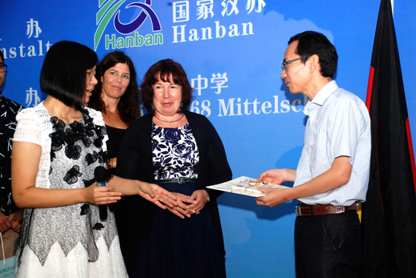 儀式結束后,雙方互贈紀念品并合影留念。據悉,今年來中國參加“漢語橋-德國中學生夏令營”活動的德國中學生主要來自德國漢諾威孔子學院、不萊梅孔子學院、萊比錫孔子學院,夏令營活動期間,他們將走入中國中學課堂,深入學習和體驗中國語言及傳統文化,切身感受中國的傳統文化氛圍。