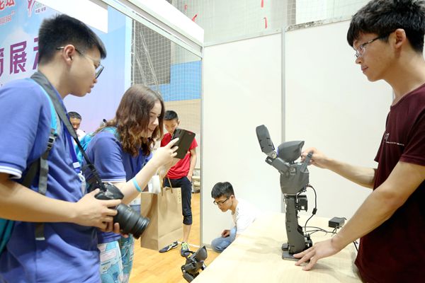在創新創業平臺展示區,來自合肥學院各系部的學生們精心準備了機器人足球、VR游戲體驗以及小型無人機等大學生科技創新項目,并現場教授了制作橡筋動力模型飛機的技巧。3D打印、水晶制作、公交智能收費機、AGV小車等一系列創客空間的優良成果,更是令參觀學生贊不絕口。