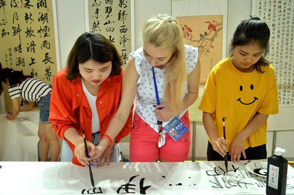 來自合肥學院翰墨軒書畫協會的大學生們現場潑墨揮毫,引得兩國青年駐足觀賞。在中方論壇青年的悉心指導下,俄方學生也紛紛留下了自己的墨寶。俄羅斯學生們體驗漢服的穿著,品味茗茶的風味,親身參與在中國古代投壺游戲之中。據了解,合肥學院大學生自主創業團隊還結合中華傳統文化,向青年論壇成員介紹了傳統皮雕、風箏以及剪紙的古樸制作工藝。