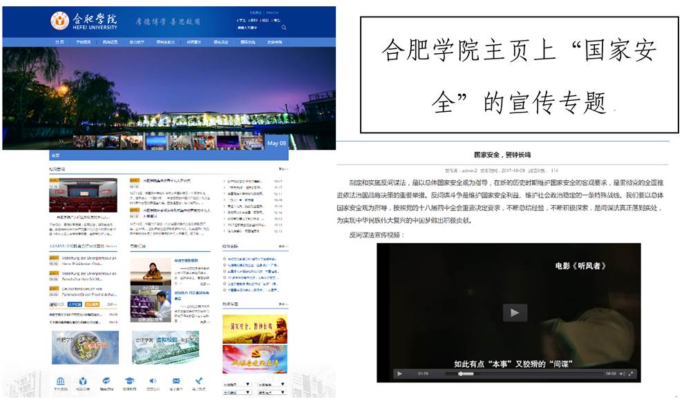 為了使廣大師生更好地學習了解《反間諜法》,進一步增強國家安全意識,合肥學院國際合作交流處積極部署反間諜法宣傳的相關工作,利用校園多個平臺向全校師生普及反奸防諜知識,并組織專家為單位開展反奸防諜的講座報告。首先,國際交流合作處充分利用學校的網絡資源,在首頁醒目位置設立國家安全專題,同學們可以通過首頁點擊到國家安全宣傳主頁http://www.pwghfqf.xyz/dd/f2/c14a56818/page.htm,接受國家安全的相關知識教育和觀看反間諜案例。國家安全宣傳主題作為學校常駐頁碼,一年365天無休向師生宣傳。