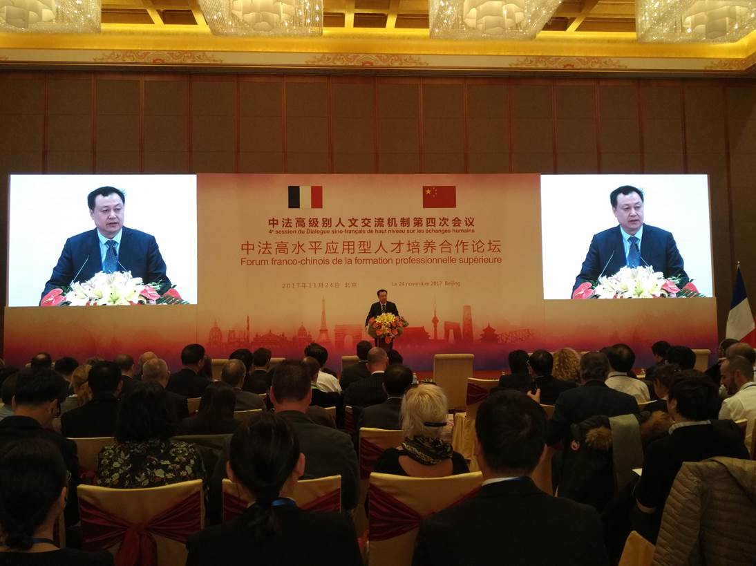 2017年11月24日,正值中法高級別人文交流機制第四次會議召開之際,由中華人民共和國教育部、法蘭西共和國歐洲事務暨外交部主辦,中國教育國際交流協會、法蘭西共和國駐華大使館承辦的中法高水平應用型人才培養合作論壇于釣魚臺國賓館芳華苑順利舉辦。國務院副總理劉延東、法國外長勒德里昂、教育部部長陳寶生出席研討會,我校黨委書記蔡敬民教授受邀參會并在大會介紹我校發展模式及經驗。