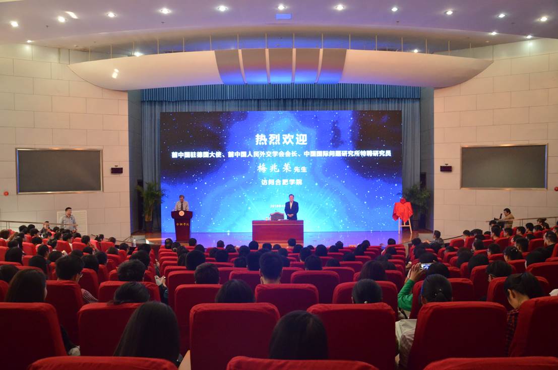 4月10日,為落實我校“中德教育合作示范基地及基金”的智庫建設工作,促進安徽省與德國在教育、文化、科技、經貿領域的相互了解與合作,中國前駐德大使、中國人民外交學會前會長梅兆榮受邀訪問我校并做“中德關系”主題演講。本次主題演講也是我校建設中的“中德教育合作示范基地及基金”的智庫平臺“中德大講堂”的第一講,講座于下午在圖書館報告A廳成功舉辦。安徽省教育工委副書記慶承松,合肥學院黨委書記蔡敬民,黨委副書記、校長王其東,副校長陳秀,紀委書記洪家友,安徽省信用擔保集團公司集團副總經理秦俊峰等人出席此次會議。各系學子到場聆聽,會議由王其東主持。