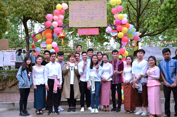 活動現(xiàn)場,柬埔寨留學(xué)生將一排排彩旗交叉相連掛在樹上,寫滿柬埔寨文字祝福語的吊牌和五顏六色的氣球交相輝映,場面格外熱鬧。兩張桌子相對放于操場正中間,其中一張桌子上擺放食物用于供奉祖先,桌前堆的沙山越高寓意越長壽,另一張桌子前的凳子則留給最尊敬的人。桌子兩邊放滿了美味可口的柬埔寨食物:大盤雞塊、燒烤和涼拌生菜,無不渲染喜慶氛圍。當(dāng)晚,更有熱情奔放的柬埔寨歌曲演奏,身著柬埔寨民族特色服裝的柬埔寨舞蹈表演等一系列精彩紛呈的節(jié)目,展現(xiàn)了自然、好客、淳樸的柬埔寨風(fēng)情。活動最后進入趣味十足的“搶樹葉”游戲環(huán)節(jié),大家積極參與其中,玩的不亦樂乎。