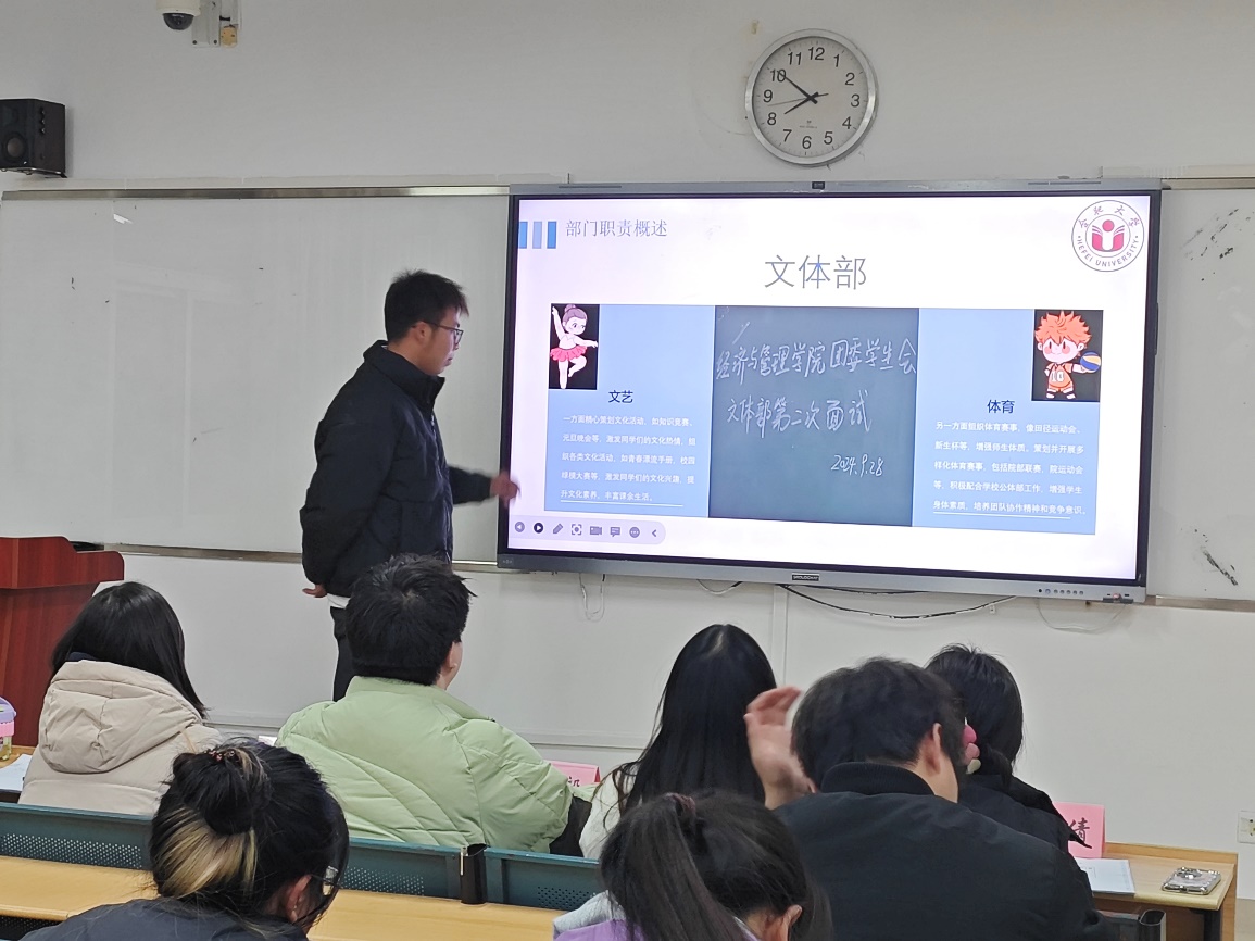 2025年1月5日晚,經濟與管理學院團委學生會述職大會在一期4-104進行。院學生會主席團及各部門部長級成員參加大會。