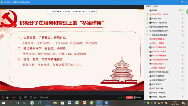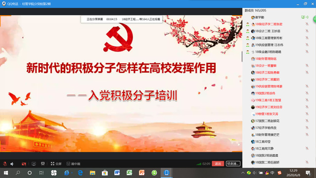 為加強入黨積極分子對黨的認識,以史為鑒、開創未來,感悟黨史、啟迪人生,2020年6月8日,經濟與管理學院副處級組織員崔學勤老師以QQ直播的形式講授了經濟與管理學院分黨校第二期入黨積極分子第八次線上黨課,黨課主題為“新時代的積極分子怎樣以黨員的標準在高校發揮作用”。
