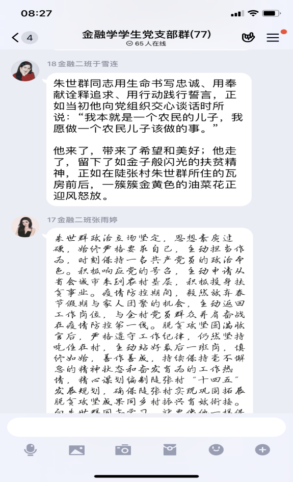 一方面,金融學黨支部黨員們借助互聯網平臺信息傳遞時效快的優勢,在支部QQ群中分享了大量朱世群同志的先進事跡,成員們暢所欲言,深刻表達了對朱世群同志的懷念和敬仰:朱世群同志扎根基層,堅持吃住在村,視貧困群眾為家人,用心用力傾情幫扶。榜樣的力量是強大的,朱世群同志為支部黨員們指引了前進的方向,讓大家向著為人民服務的宗旨、為實現共產主義的最終理想而不懈努力!作為我校的教師榜樣,支部黨員要學習他恪盡職守、真抓實干的務實作風,學習他對黨忠誠、無私奉獻的崇高風范。
