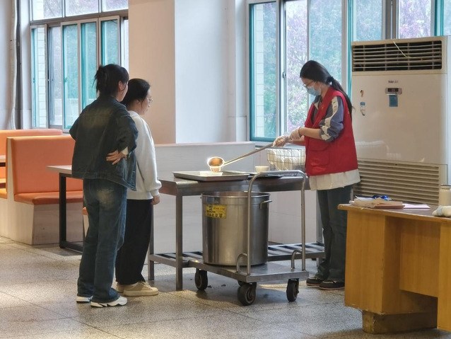 活動當天,青年志愿者們準時來到食堂開展工作。志愿者們分工進行了打湯、清理餐桌、回收餐盤等工作,并協助食堂阿姨用小推車將餐盤送至后廚。志愿活動有序地進行,就餐的師生對志愿者們的服務表示贊賞。