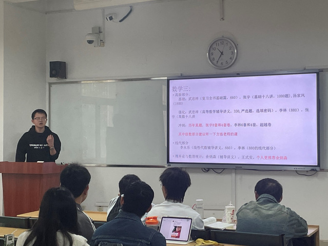 會上,于老師簡要介紹了經(jīng)管學(xué)院20級整體考研及就業(yè)情況,深入分析了當(dāng)下的考研和就業(yè)形勢,鼓勵同學(xué)們積極進取、努力拼搏,虛心接受學(xué)長的建議。隨后,張忠兵、唐肖鋒分別為同學(xué)們講解了在備考期間應(yīng)該注意的問題,包括考研各科的復(fù)習(xí)方法、備考計劃、院校選擇、作息時間安排等,同時建議考研、考公的同學(xué)可以在下學(xué)期積極參加校園招聘會,在備考的同時可先與意向單位簽約保底,緩解心理壓力。在現(xiàn)場提問環(huán)節(jié),張忠兵、唐肖鋒悉心解答了同學(xué)們提出的各種問題,并給出了有針對性的參考建議,進一步堅定了在場同學(xué)們的備考信心。