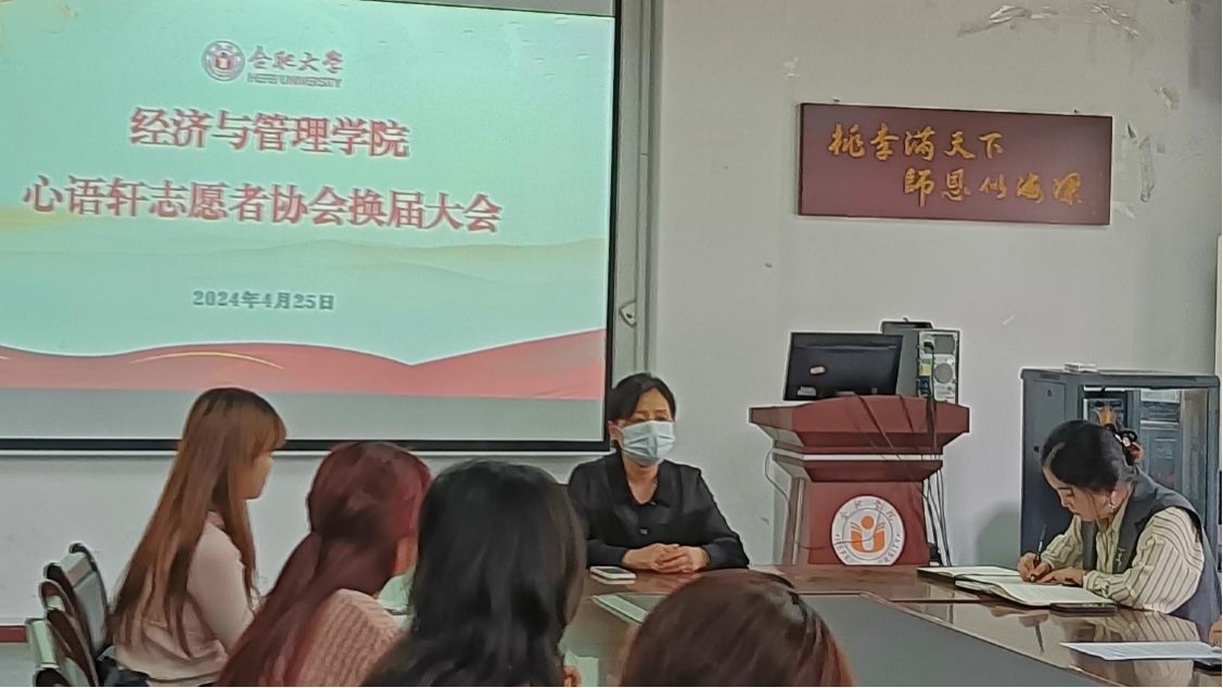 2024年4月25日,經濟與管理學院心語軒志愿者協會換屆大會于六棟223會議室順利召開。會議由經管學院二級心理工作站負責人白杉主持,經管學院黨委副書記夏丹青出席會議,經管學院心語軒志愿者協會全體會員參加會議。